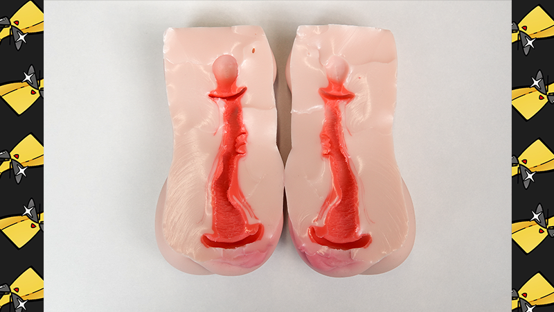 扒开能看到入口的双阴设计,有两个小豆豆老实说有点怪,之后是正上方的肉突,内部纤细的纹路看上去是偏仿生的类型,刺激度可能不会很高,不过具体怎么样还是要实战试试。