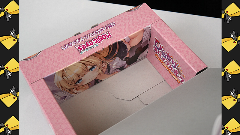 盒子顶面是宫濑真寻(宮瀬まひろ)老师绘制的可爱金发美少女,背景的镜子反射了纯白胖次(彩蛋),作者名字于右侧有标注。