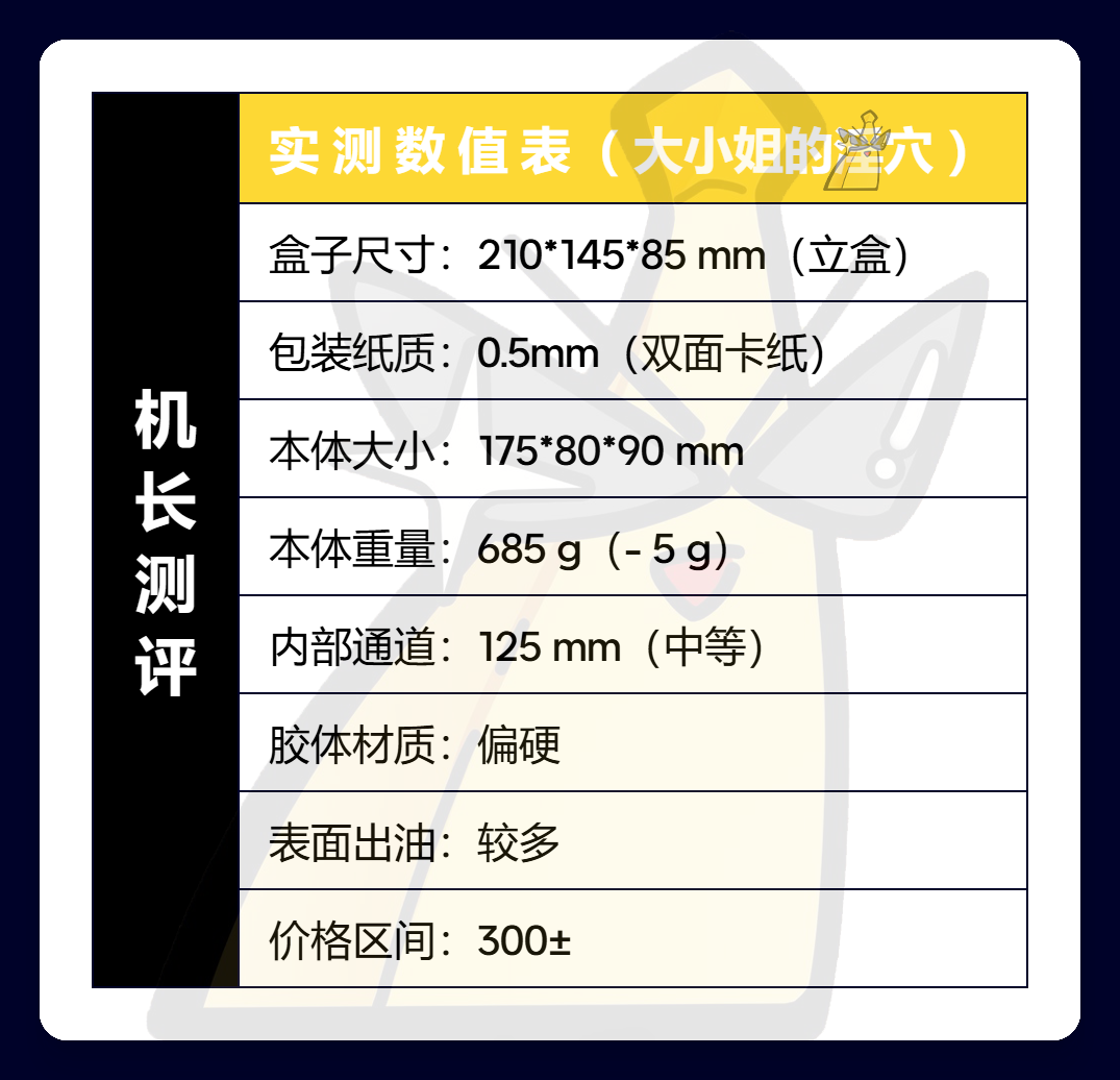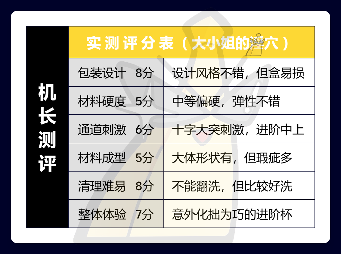 总的来说,汤玛这款“大小姐”的整体刺激我是比较满意的,十字大肉粒的交错按摩感我相当喜欢,分量很足,中等偏上的进阶刺激度也相当对机长口味。